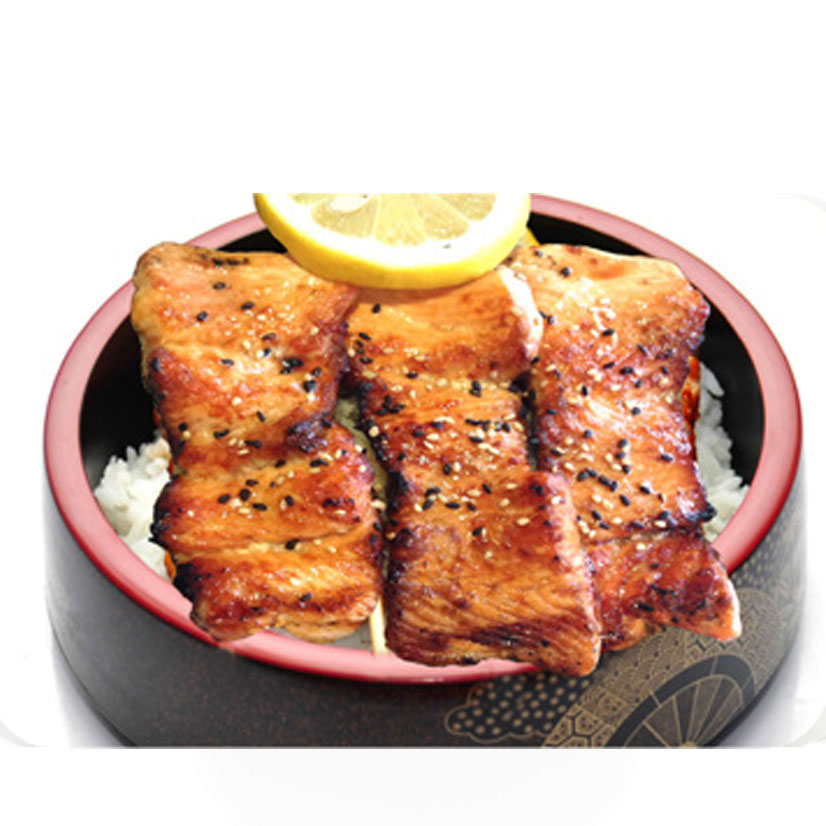 Saumon grillé dans un grand bol de riz blanc