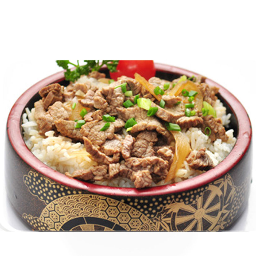 Boeuf aux oignonssur un grand bol de riz blanc